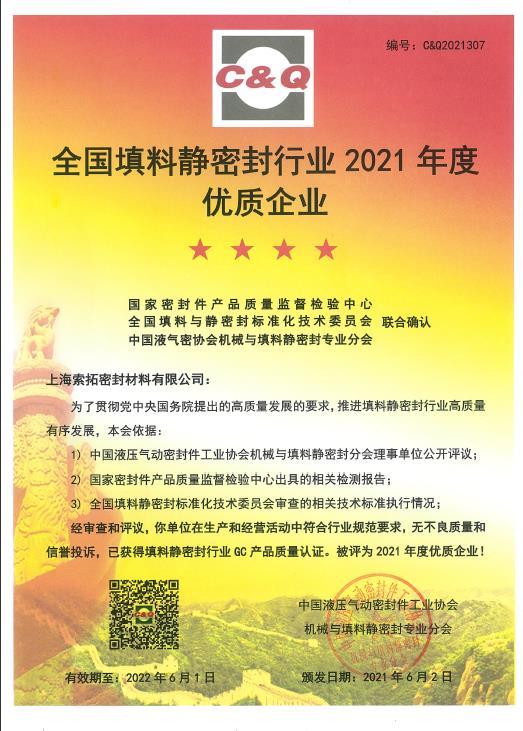 我司獲得全國(guó)填料靜密封行業(yè)2021年度優(yōu)質(zhì)企業(yè)稱號(hào)